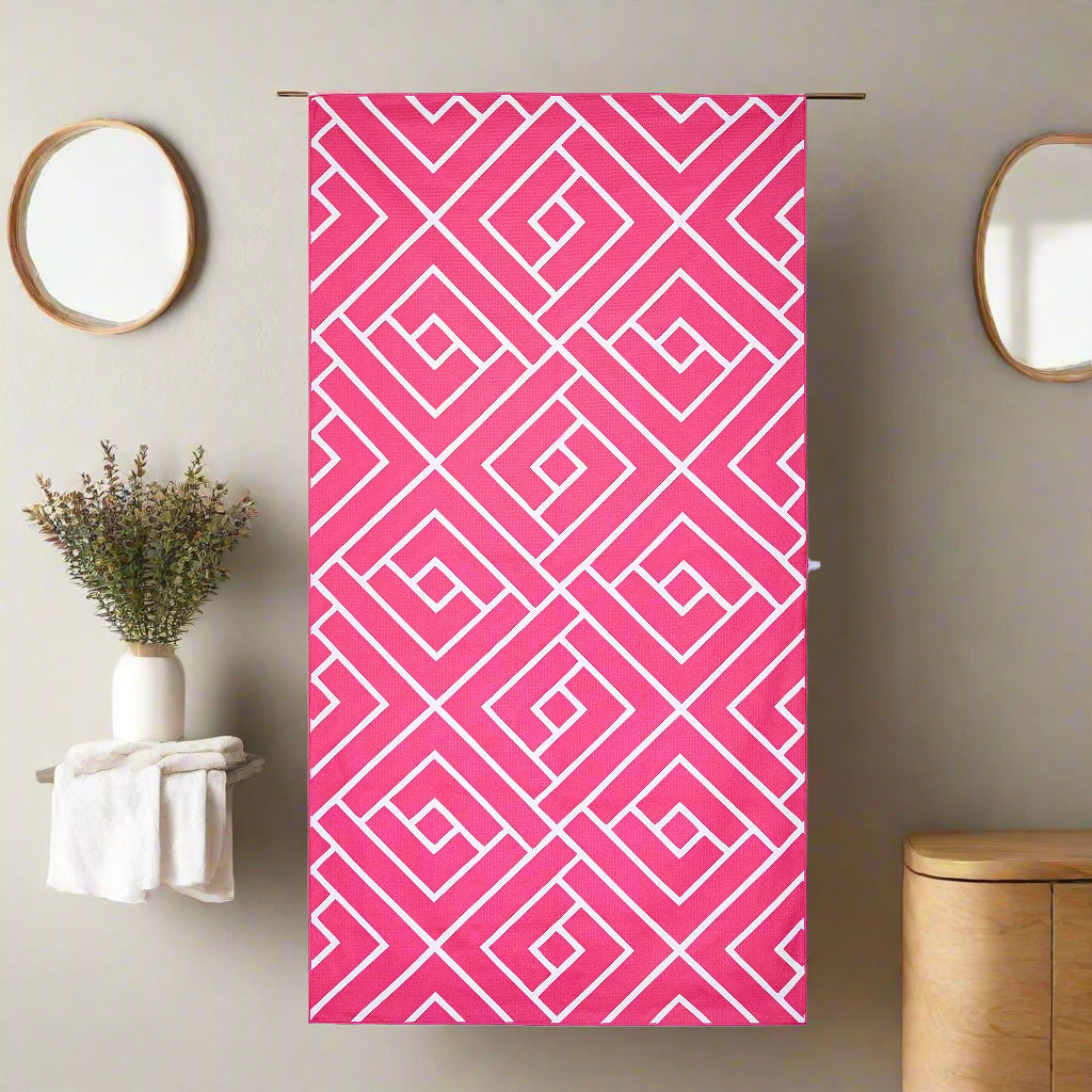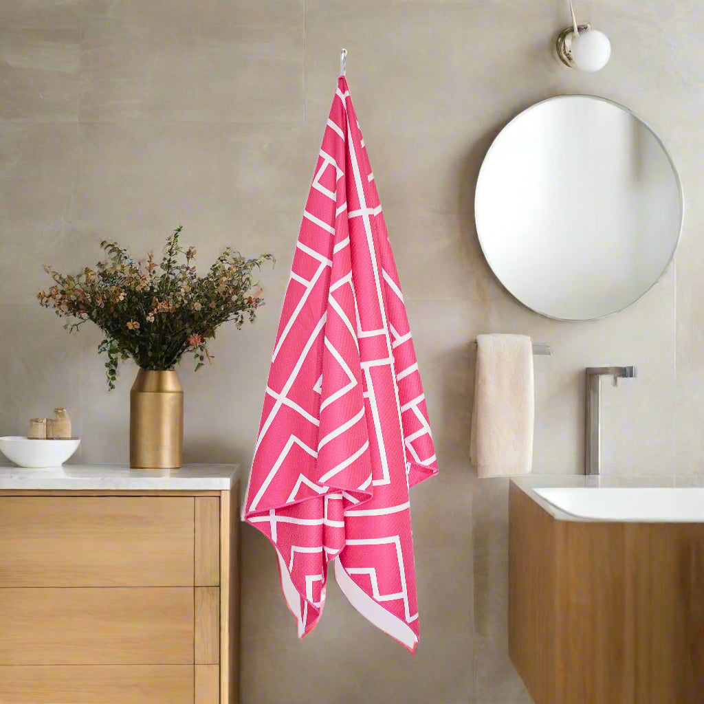 Made from premium ‘waffle weave’ microfiber, they’re slightly thicker than our ‘suede’ microfiber beach towels, offering that super soft ‘plush’ feel that we all know and love after a shower! Easy to hang anywhere with the handy hanging loop.